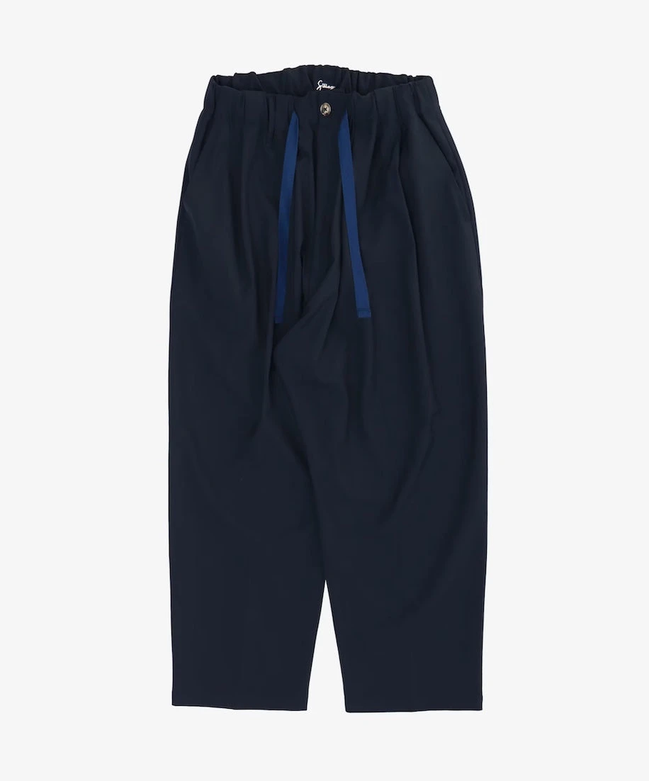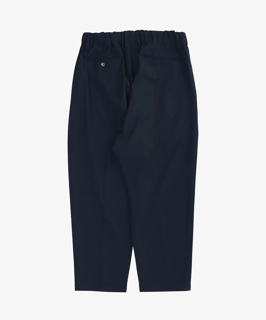 The Baggy Trousers are easy pants featuring 2 tucks on the sides, as well as a comfortable rubber waist featuring drawcords. Here in its most versatile version in Tropical Wool, which is a super fine gauge, summer worsted wool, it is suitable for any type of climate. This navy version is limited.