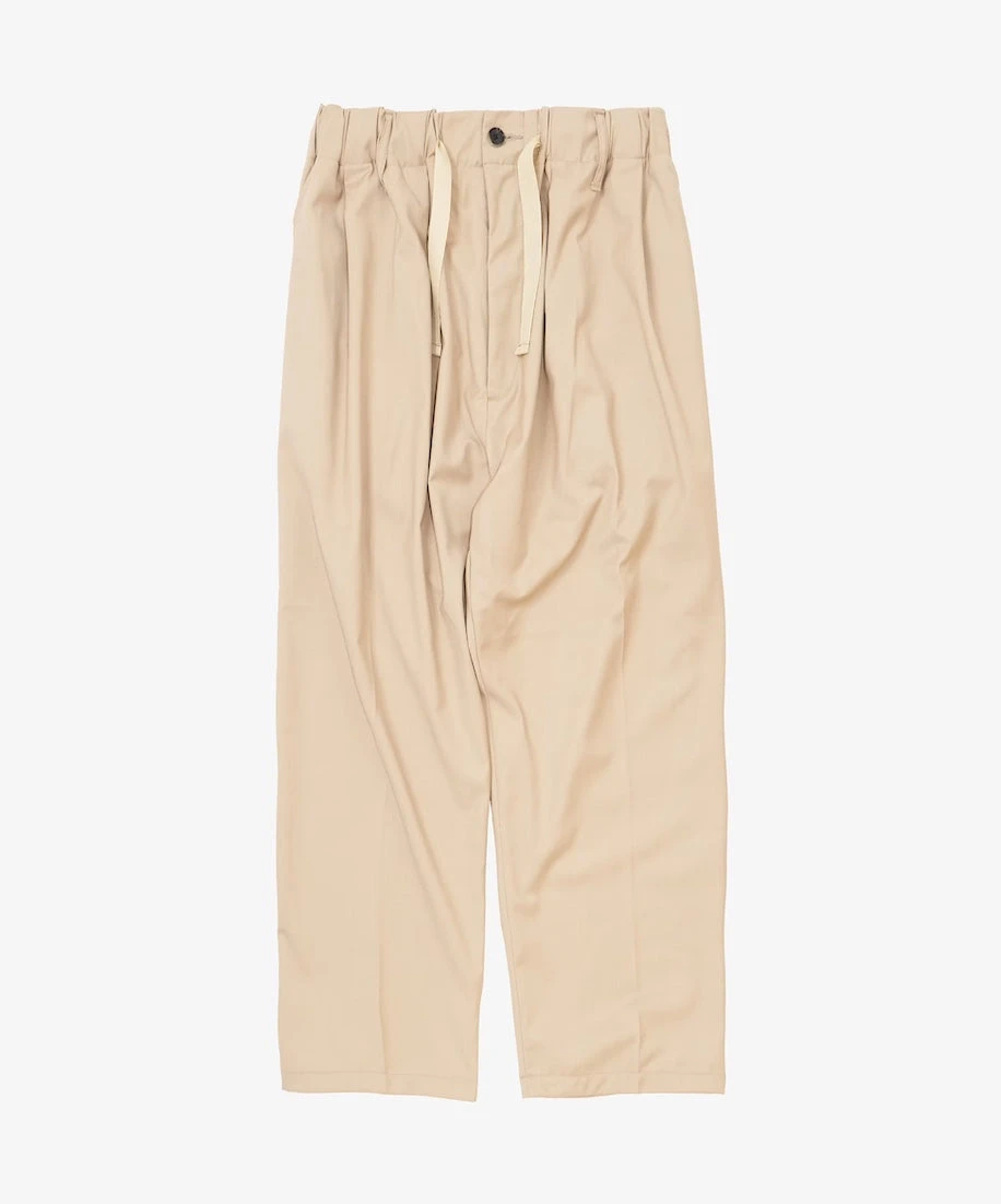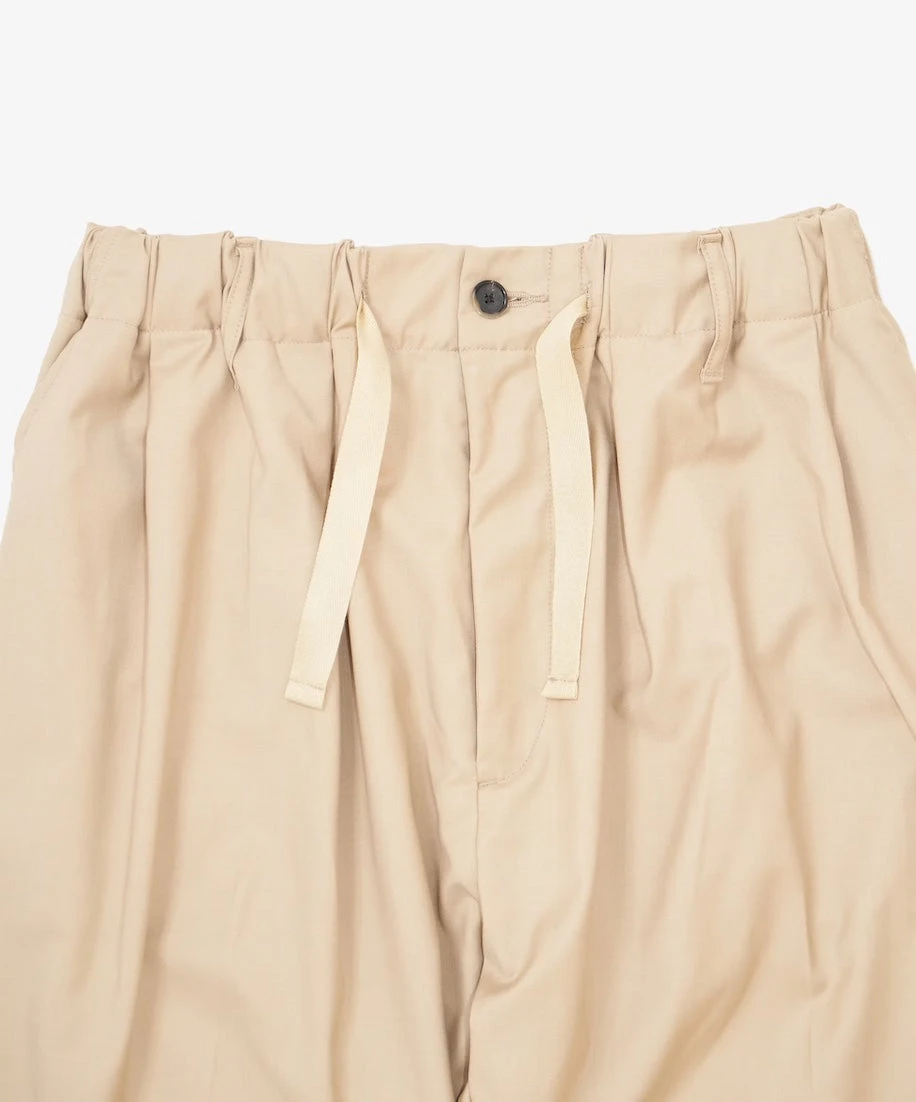 The Baggy Trousers are designed for comfort, featuring two side tucks and an adjustable rubber waist with a drawcord. Made from Tropical Wool, a lightweight, super-fine summer worsted wool, these trousers are versatile enough for any climate.