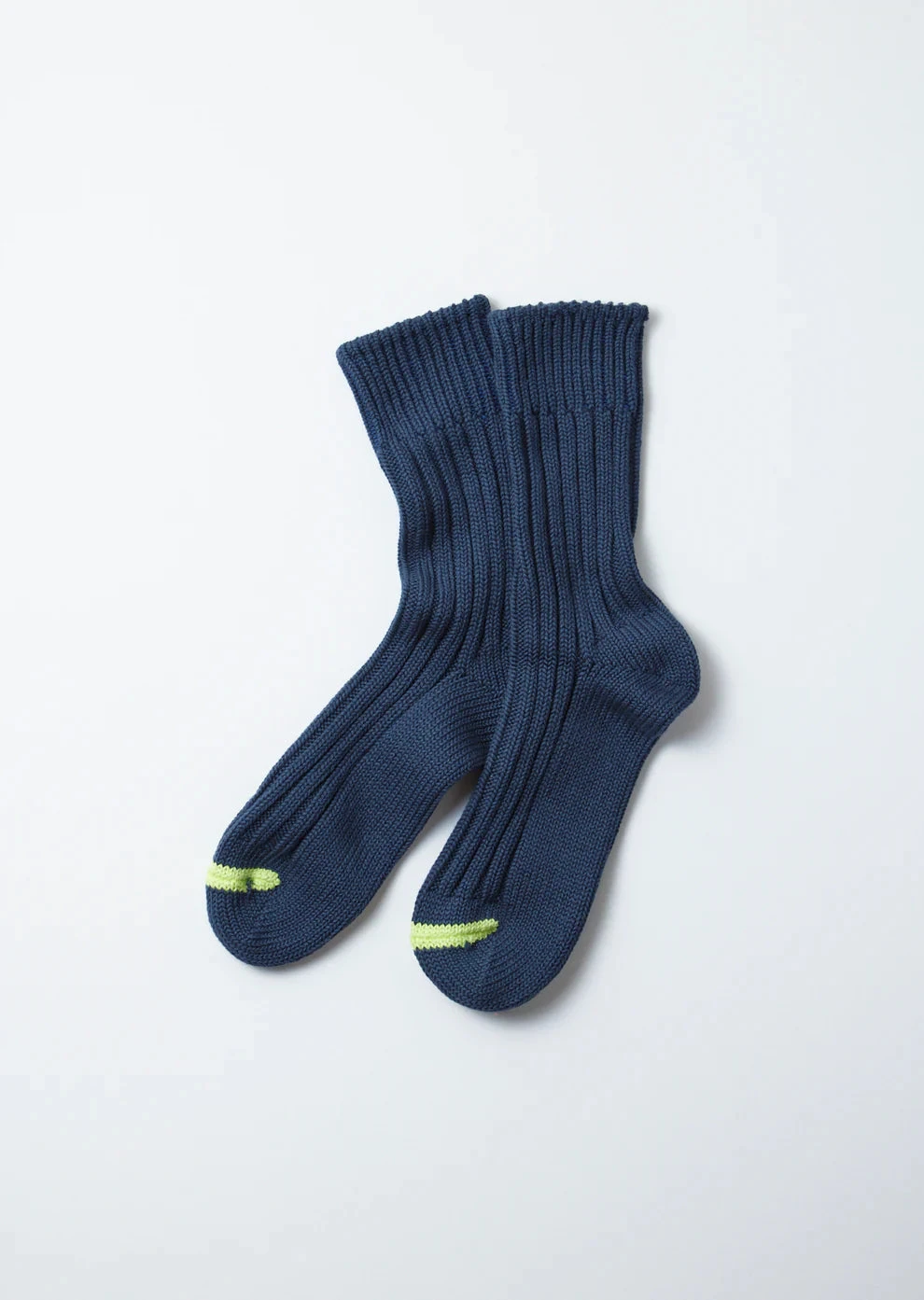 These chunky organic cotton ribbed socks are knitted with an old-style low-gauge knitting machine that only a few craftsmen can operate. The eye-catching coloration is inspired by outdoor wear made in the 1980s and 1990s. The fabric is thick and tough, but also has excellent breathability because of the chunky stitches. Each pair goes well not just with sneakers but also with sandals.