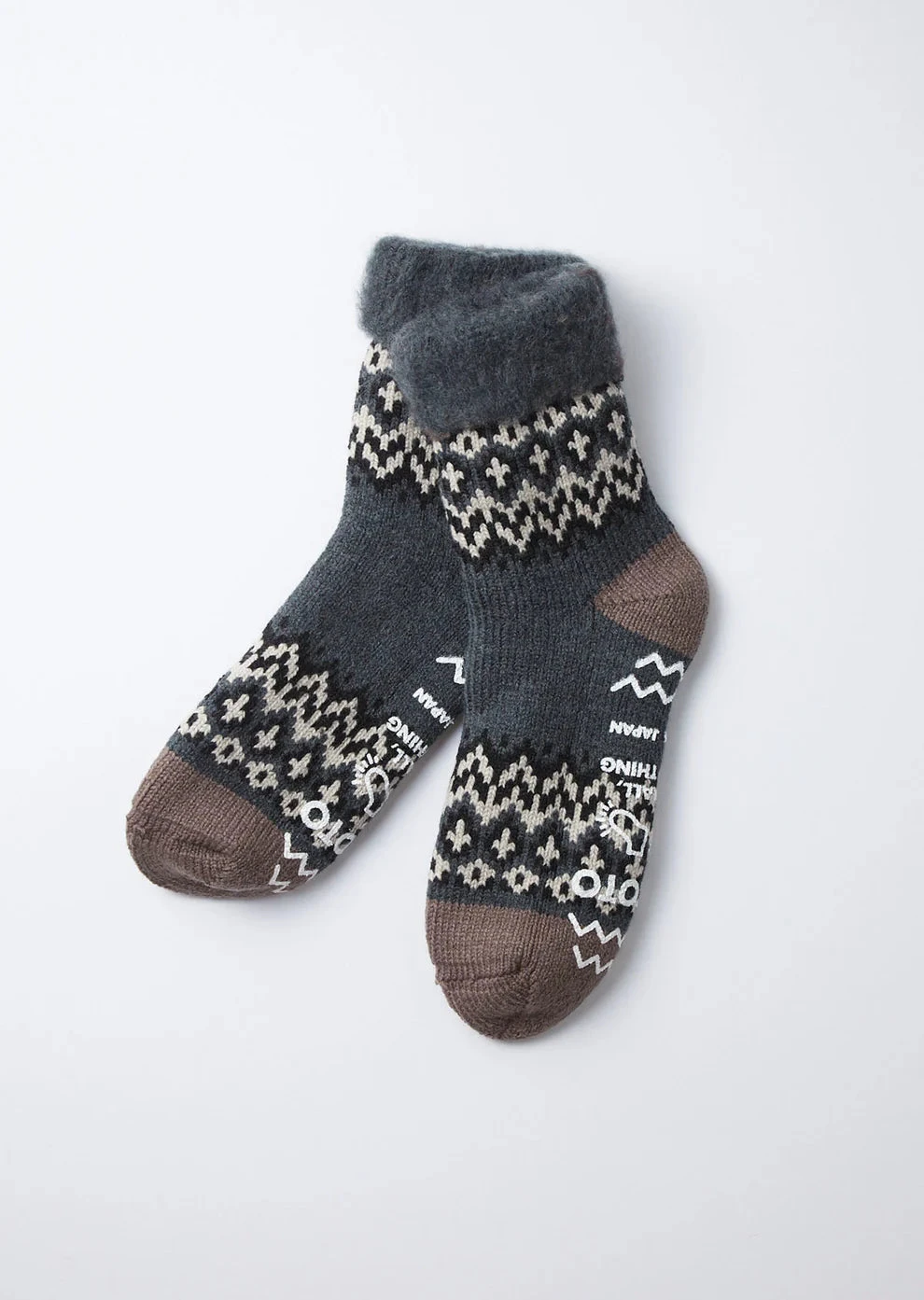 These chunky slipper socks are knitted with a machine specially made to produce fisherman’s socks and other work socks. Made of soft, comfortable and heat-retaining acrylic/wool blend yarn, the fabric enhances the heat-retaining properties even more with a liner that is brushed after being knitted. Featuring an interior elastic band placed a little lower than the sock hem, the pair can be worn also with the hem turned. Slip-resistant rubber print on the sole adds extra functionality to these socks.
