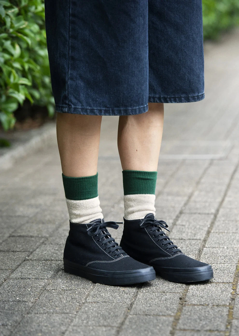 These double-layer socks are knitted by skilled craftsmen with a hard-to-find machine in the town. The surface fabric is made of colored cotton, while undyed silk is used for the lining. To bring the best out of the advantages of silk, such as moisture absorbency as well as heat and moisture retention, the liner fabric is finely knitted with a pile surface.