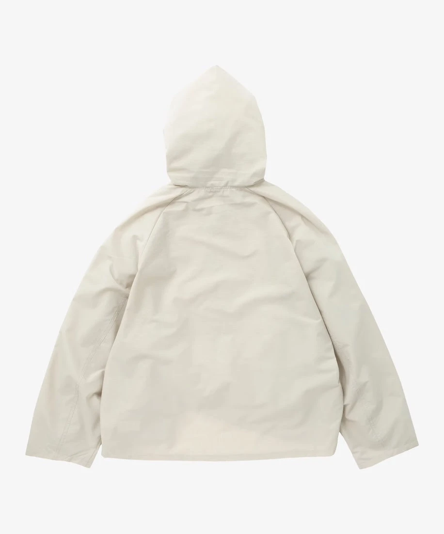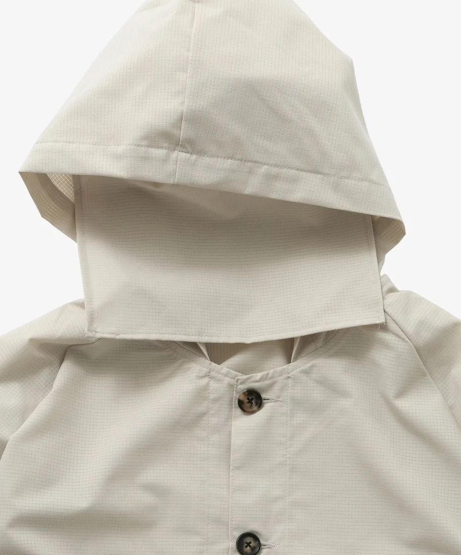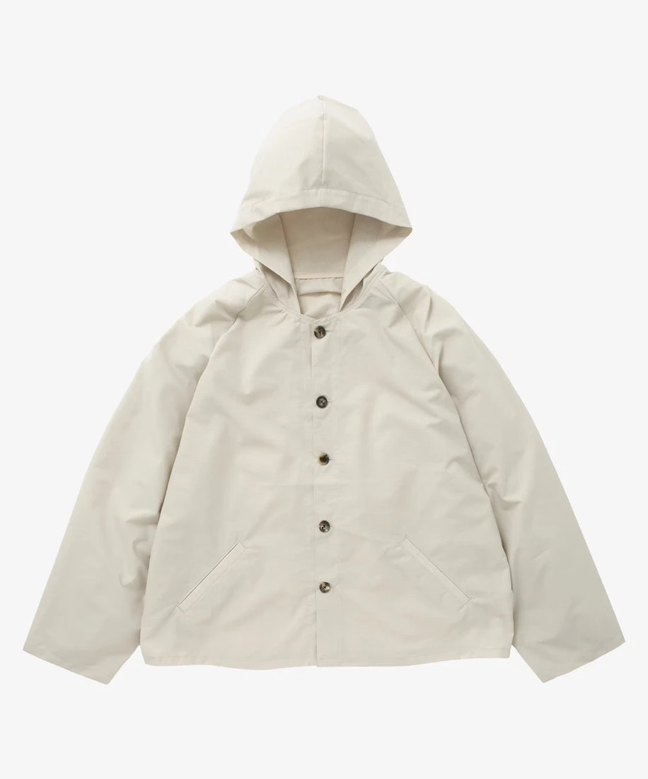 This item is inspired by vintage military hoodies, featuring horn buttons at the front and Sillage’s signature wide silhouette. The hood includes a fabric designed to cover the face, a practical military-inspired feature for protection against insects while sleeping outdoors.
