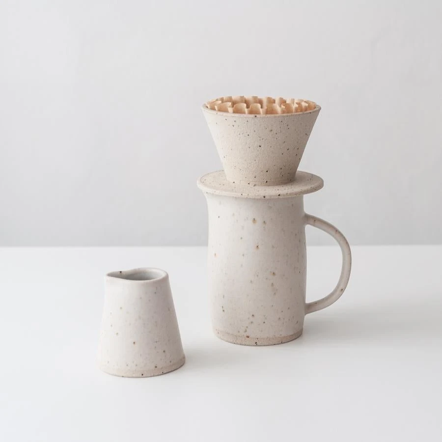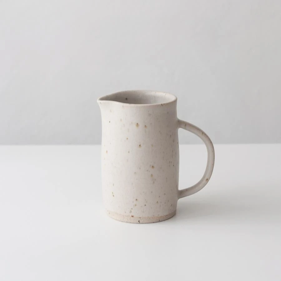 Simple multi-use jug glazed in our matte white on speckled clay. The speckled look of this clay is created by iron deposits which when fired emerges through the glaze.