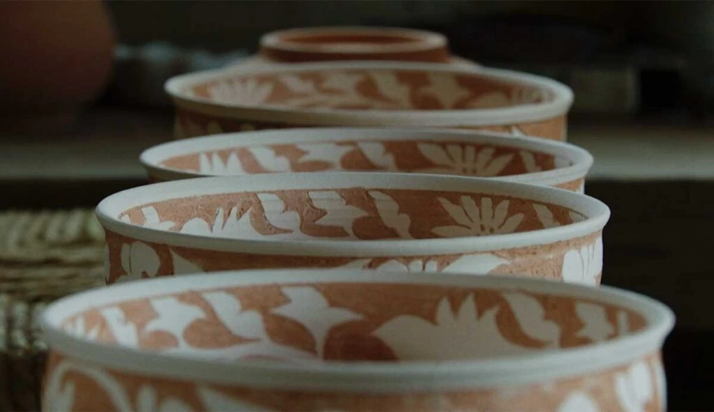 Slip is coated upon still soft greenware, and bird and flower patterns are carved in lines. The motif is revealed after scratching off around the drawn lines.
