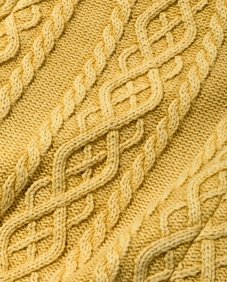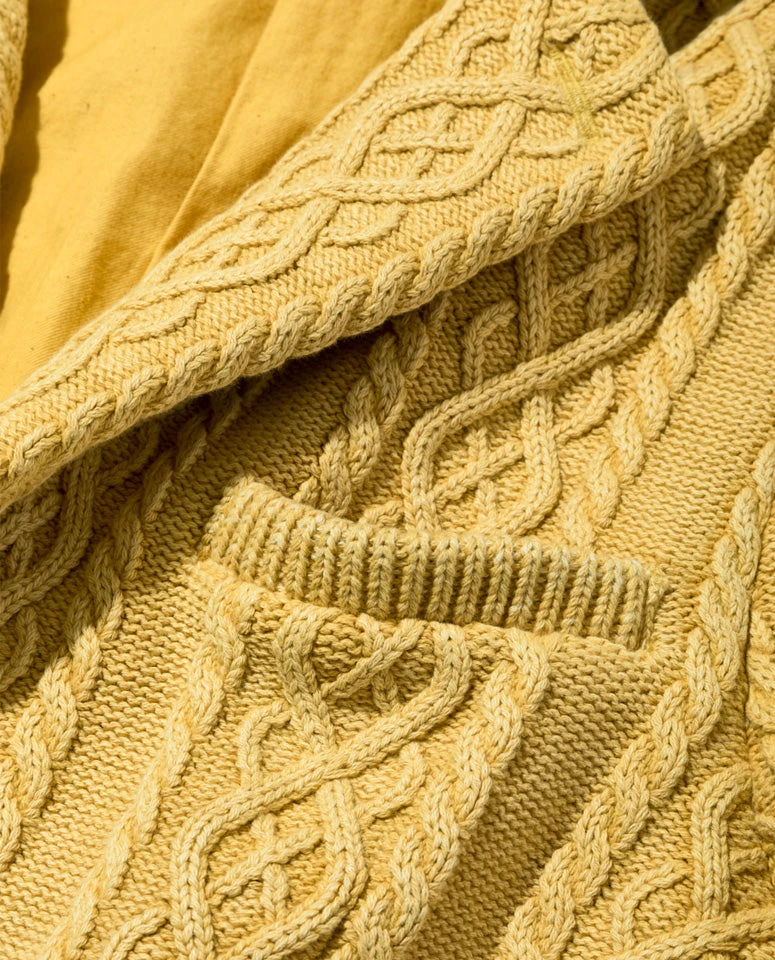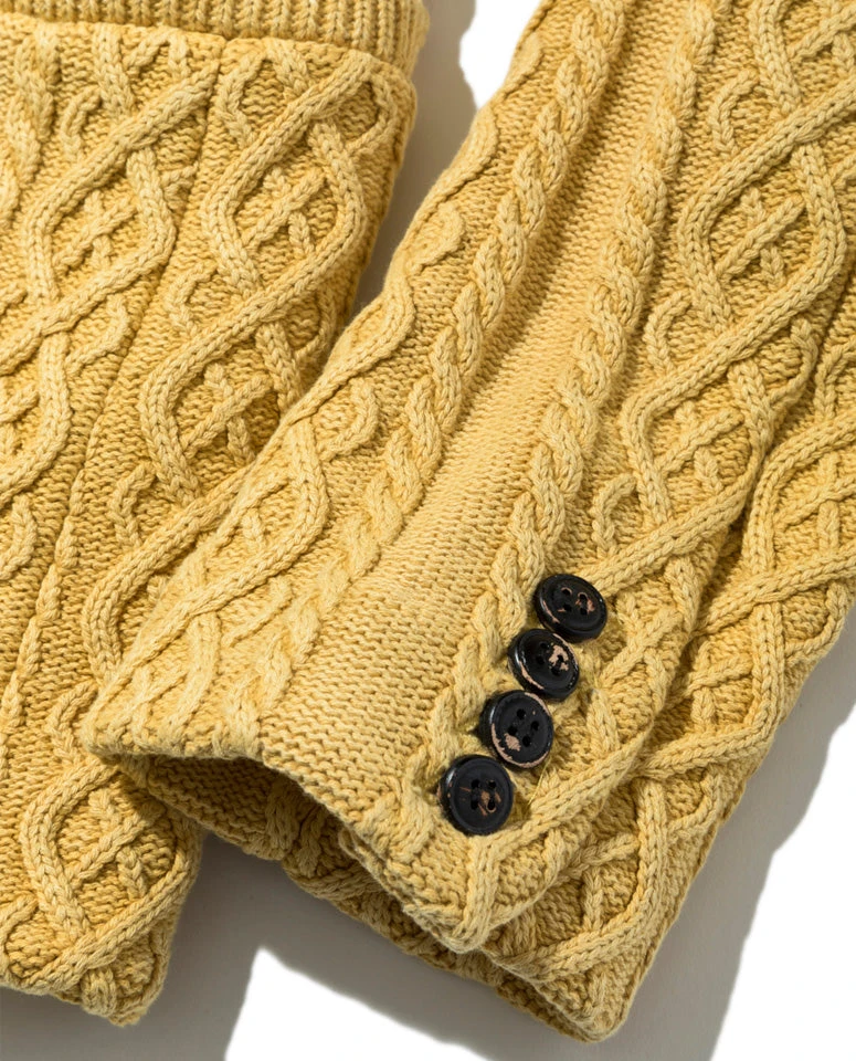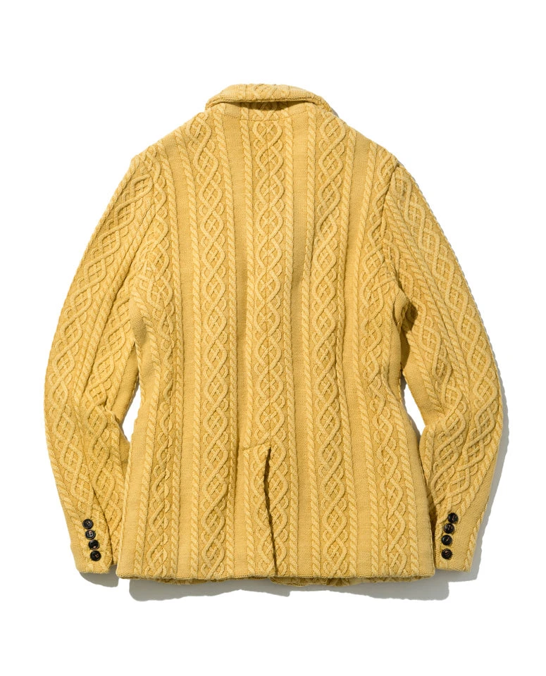 The tailored jacket is knitted into an aran sweater pattern, and the sandblast processing allows for a vintage and soft aesthetic. The silhouette’s slight compact finish and the elasticity of the knitted fabric, makes it comfortable to wear. Although it is crafted 100% from cotton, due to how tightly woven it is, it can be worn from spring to winter.