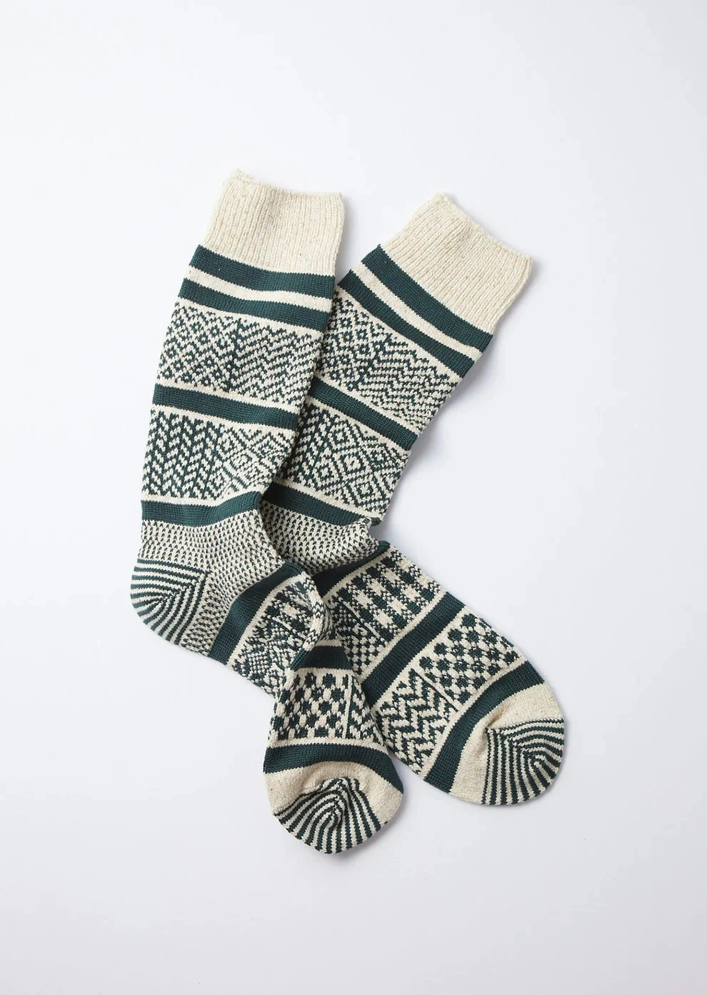By mix and matching a series of the brand’s exclusive patterns, these socks overcome the major fault of jacquard socks, lack of horizontal stretch. Although most patterned socks have many loose yarns on the reverse side, ROTOTO’s jacquard socks are carefully knitted not to leave loose yarns for better comfort. Extraordinary skills and creative enthusiasm of sock craftsmen makes this item look beautiful even on the back side.