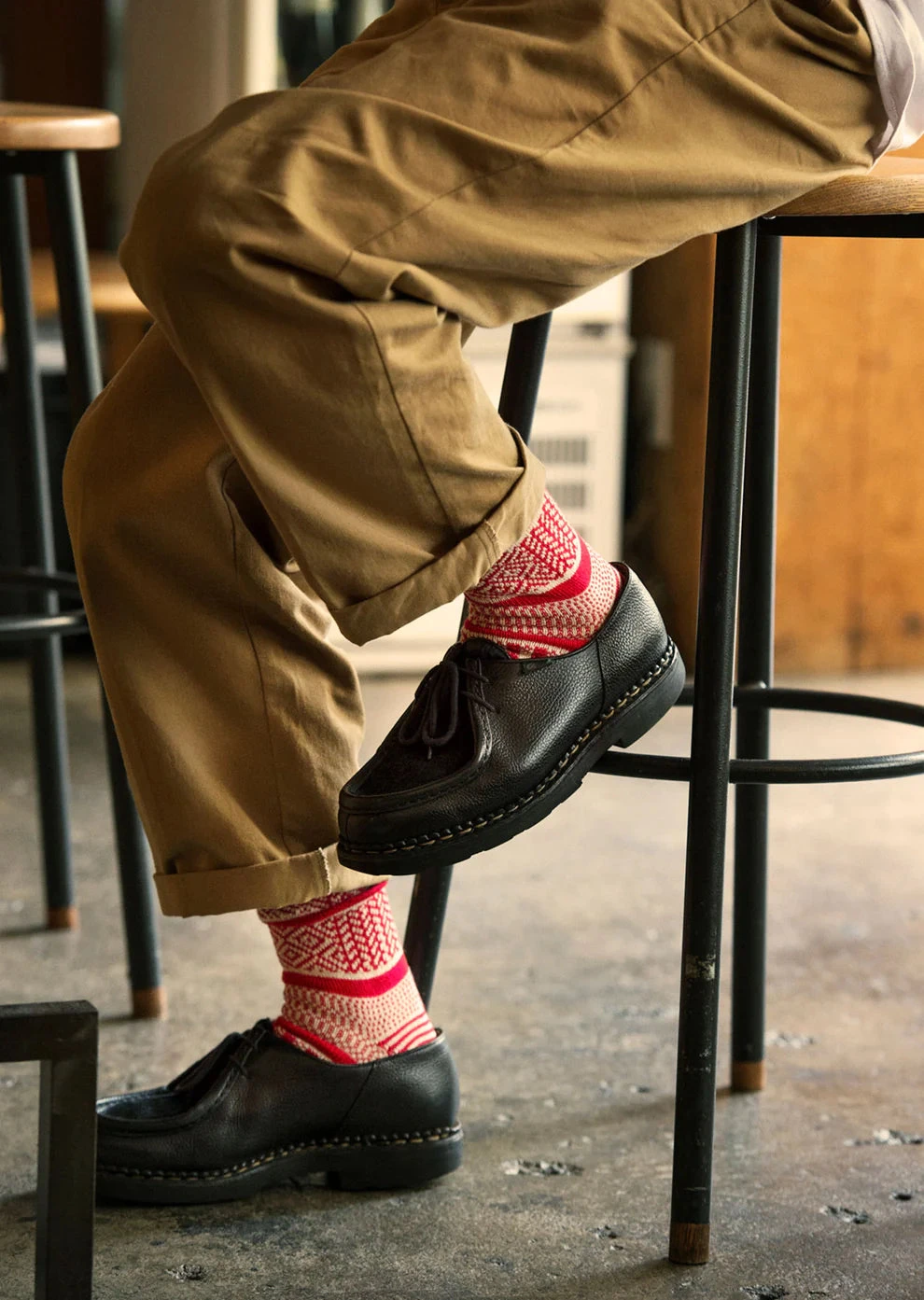 By mix and matching a series of the brand’s exclusive patterns, these socks overcome the major fault of jacquard socks, lack of horizontal stretch. Although most patterned socks have many loose yarns on the reverse side, ROTOTO’s jacquard socks are carefully knitted not to leave loose yarns for better comfort. Extraordinary skills and creative enthusiasm of sock craftsmen makes this item look beautiful even on the back side.