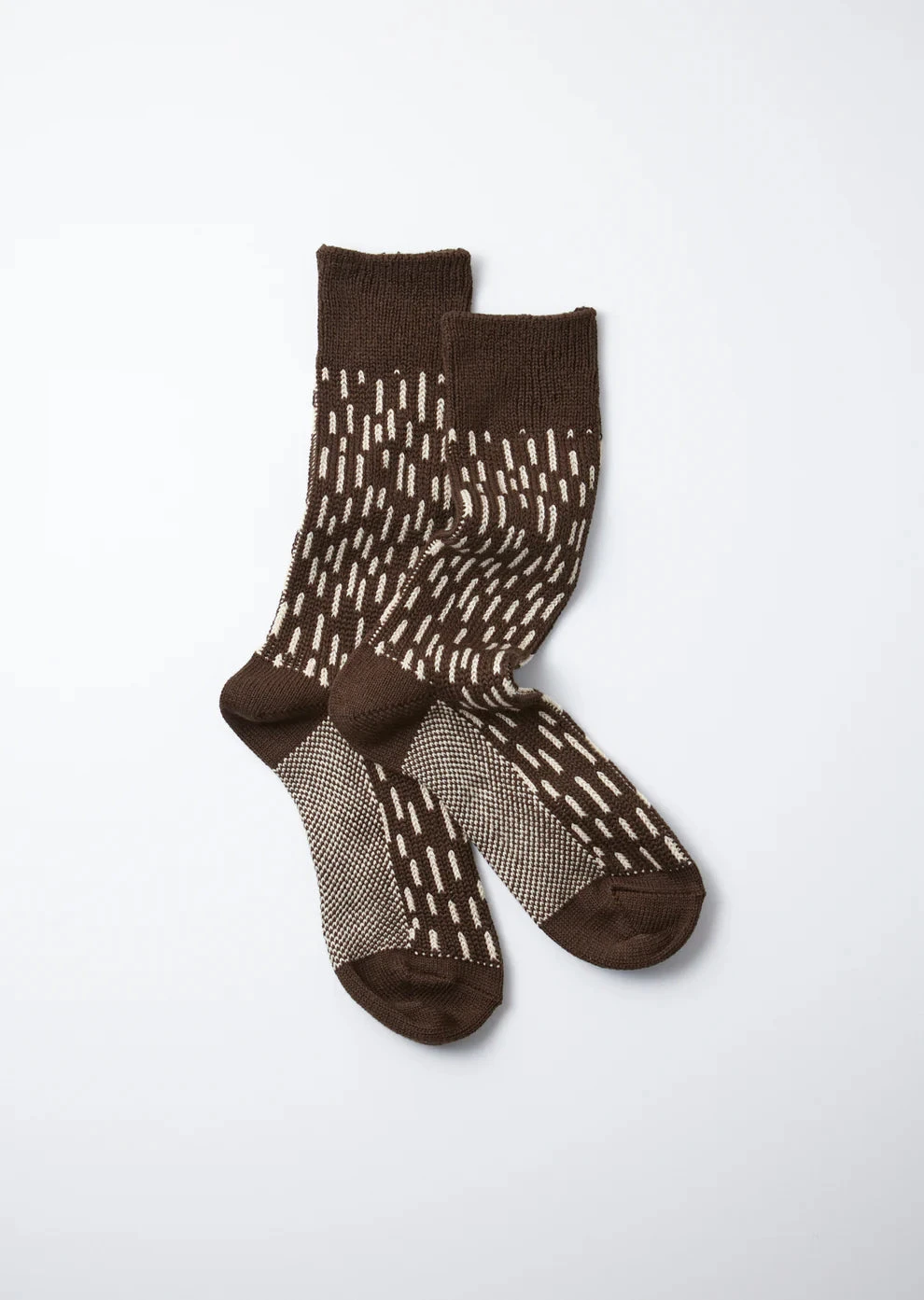 This unique pattern adopted by the East German Army and the Czech Army is now known as the Raindrop Camo because it looks like falling rain. By adding a modern twist to the design, the classic pattern is beautifully knitted in a pair of socks with a low-gauge knitting machine. Yet with chunky texture, the item naturally blends in not just casual outfits but also sophisticated looks.
