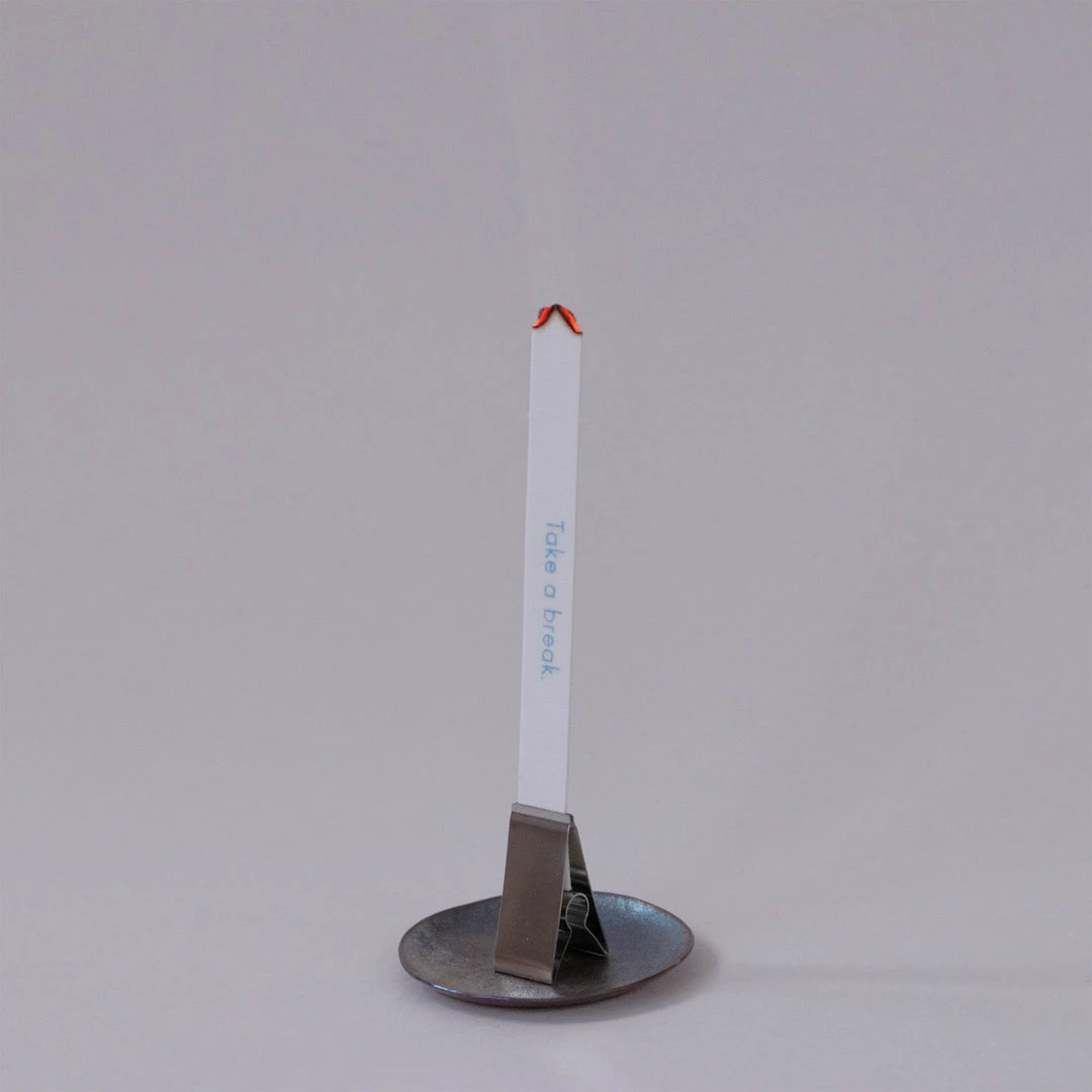 How to use:Â Attach the included metal clip to the bottom of a strip of incense, then light the free end of the incense. Blow out the flame, leaving the paper strip to smolder, then set the incense down on a flat, non-flammable surface, using the open ends of the clip as a stand. Each strip burns for approximately 5 minutes.