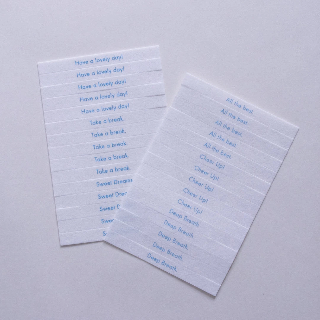 On each individual strip is printed words of encouragement, with notes such as “Cheer Up!” or “Take a Break” providing messages of warmth and solidarity as they fill a space with fragrance. Slip one into a gift or card as an aromatic affirmation, or enjoy this incense at home as a way to brighten your day.
